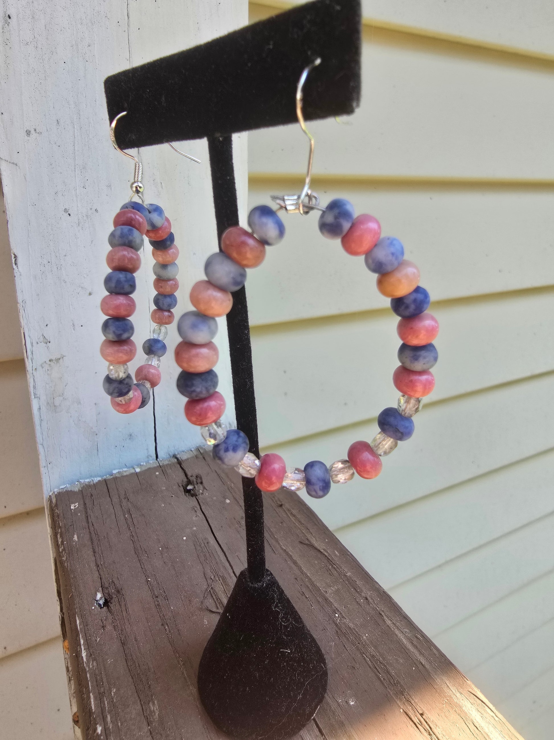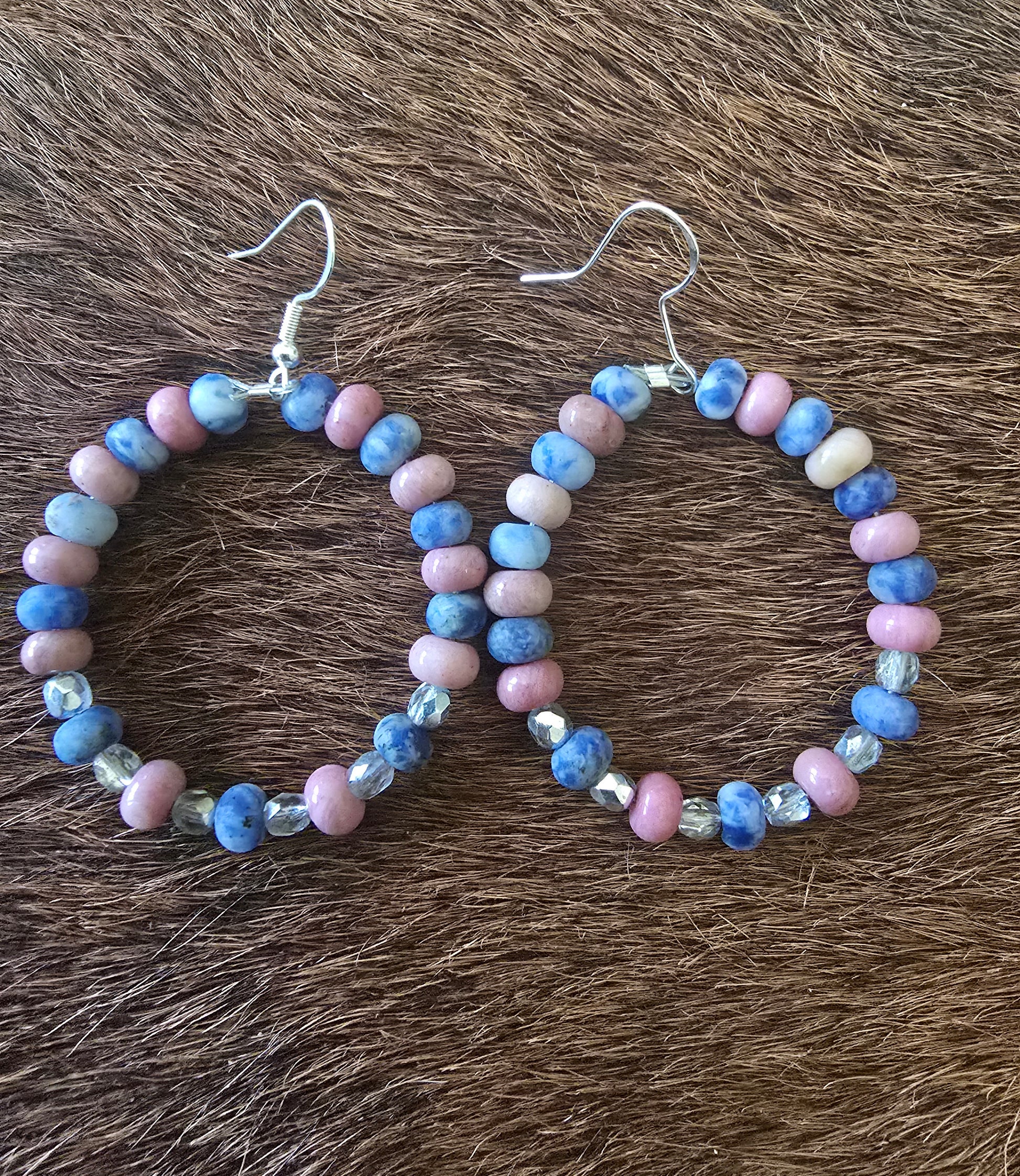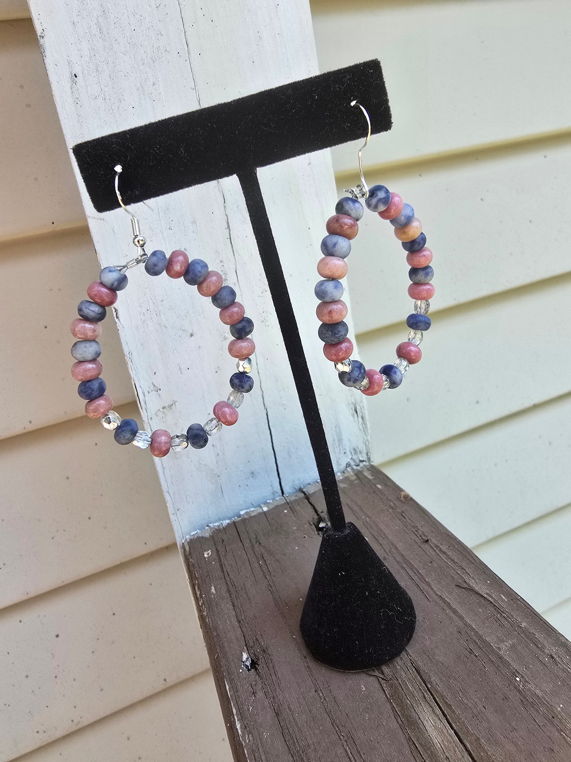 Large 2" drop hoops - 6mm Pink Rhodonite and Snowflake Sodalite rondelles, semi-clear sparkle beads, sterling silver materials, 925 stamped sterling silver hooks. On coated stainless steel wire that will not snap!