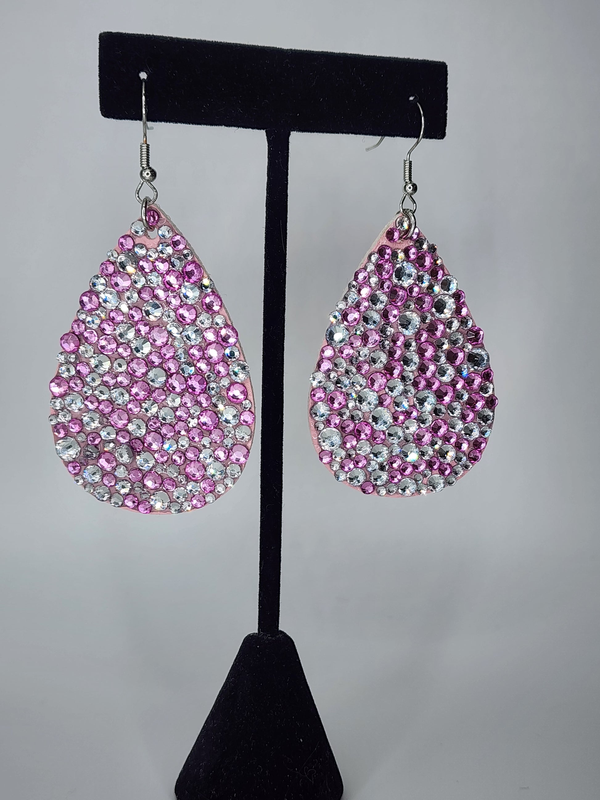 Handmade by me 🫶 Pink faux leather teardrops with pink and silver rhinestones 💓 Ultra lightweight earrings!Â