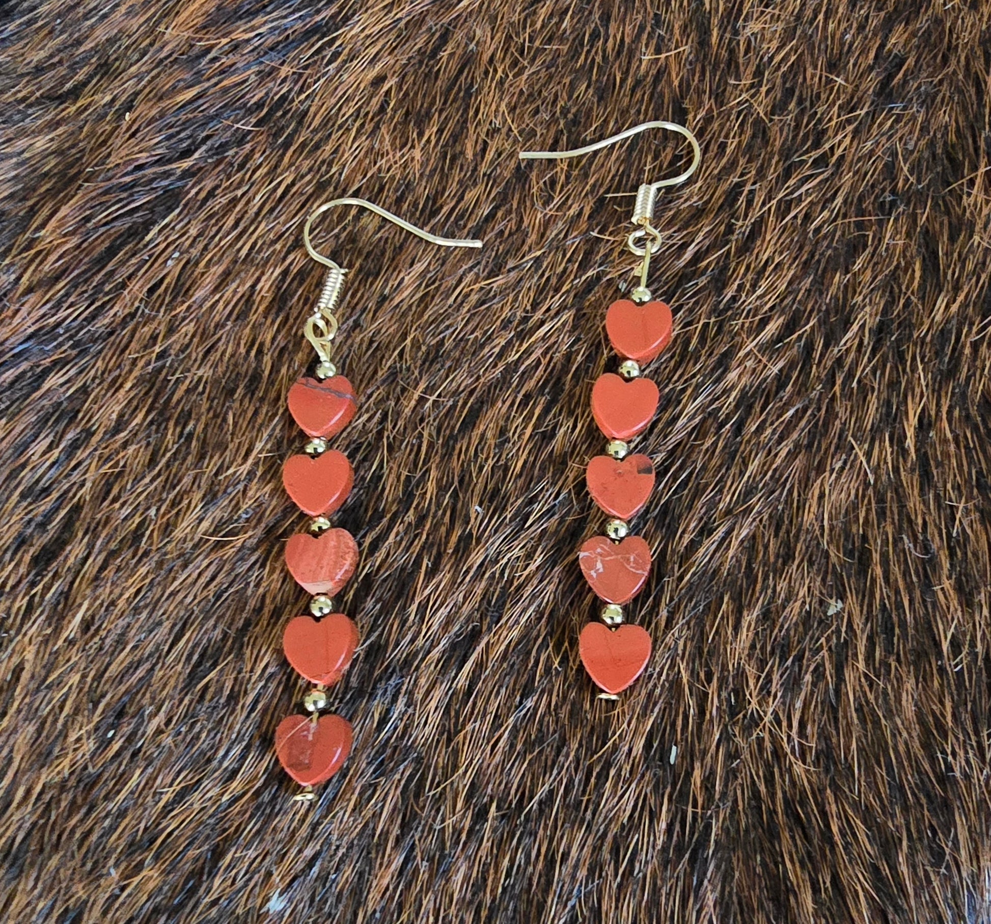 2" drop earrings - Authentic Red Jasper heart beads, 3mm 18k Gold filled beads on gold plated hooks.